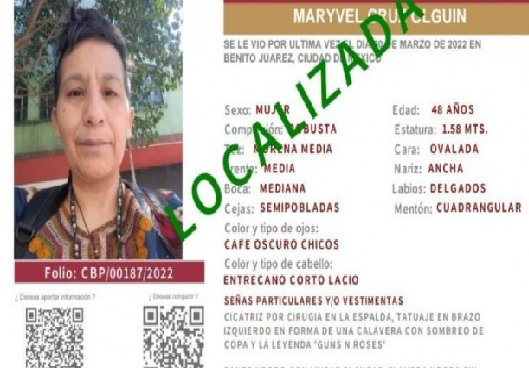 El pasado 30 de marzo se reportó la desaparición de Maryvel Cruz Olguín, de 48 años de edad, que fue vista por última vez en la colonia Narvarte Poniente, en la alcaldía Benito Juárez.