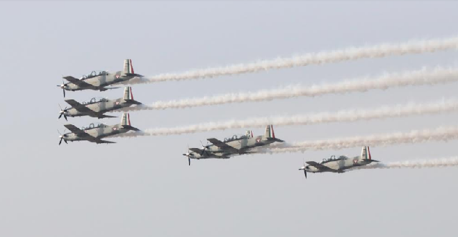 Uno de los espectáculos más llamativos, fue la presentación aérea, realizada por aviones de la Fuerza Aérea Mexicana, que surcaron el cielo de la capital oaxaqueña.