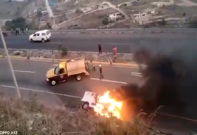 En el lugar una camioneta de cabina con batea sufrió volcadura, después ardió en llamas, afortunadamente los ocupa antes lograron salir al tiempo y presentan lesiones.
