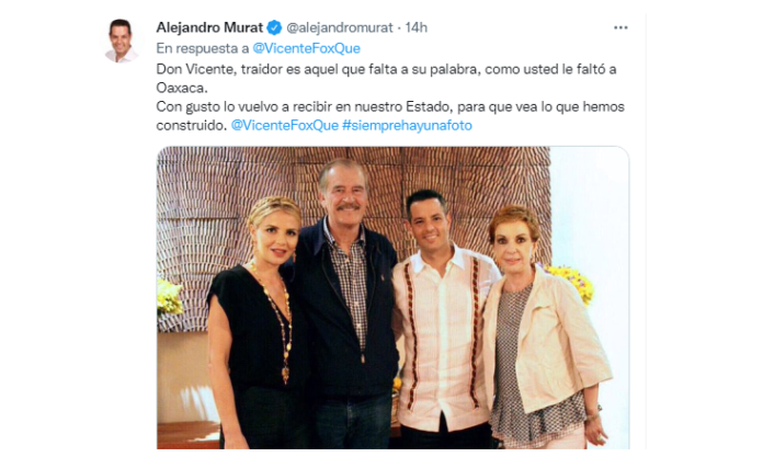 “Don Vicente, traidor es aquel que falta a su palabra, como usted le faltó a Oaxaca. Con gusto lo vuelvo a recibir en nuestro Estado, para que vea lo que hemos construido”, escribió.