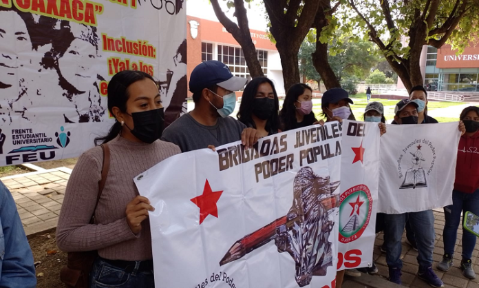 Oaxaca de Juárez. Integrantes de Brigadas Juveniles del Poder Popular se manifestaron este lunes para exigir la ampliación de la matrícula en la Universidad Autónoma Benito Juárez de Oaxaca (UABJO).