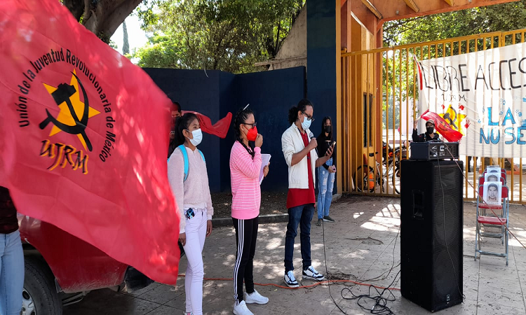 Oaxaca de Juárez. Integrantes de la Unión de la Juventud Revolucionaria de México (UJRM), protestaron este martes en las instalaciones de Rectoría de la Universidad Autónoma Benito Juárez de Oaxaca (UABJO).
