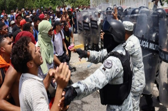 Migrantes chocaron este miércoles con agentes de la Guarda Nacional (GN) en el centro aduanal de Huixtla, cuando a gritos y empujones exigían ser atendidos para conseguir el permiso para transitar libremente por el territorio mexicano rumbo a la frontera con Estados Unidos.