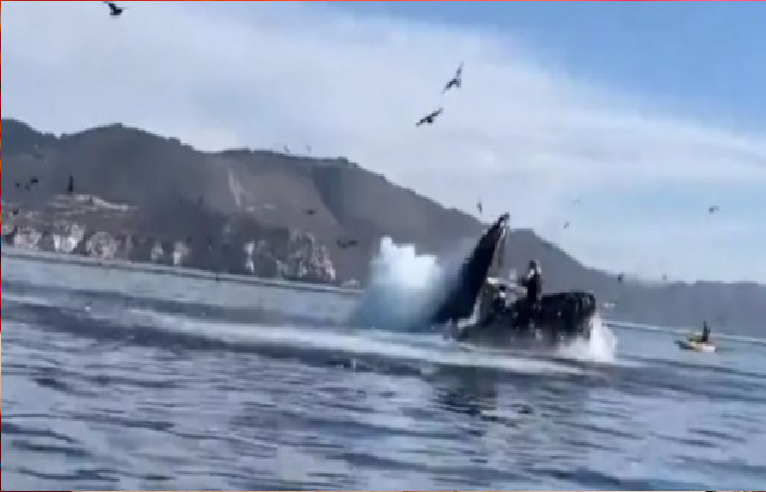 Según se observa en los videos viralizados en redes sociales, una gigante ballena jorobada casi se las traga mientras practicaban kayak.