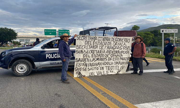 Integrantes de la Asamblea Comunitaria de Teotitlán del Valle bloquean la carretera federal 190 a la altura de la desviación de ese municipio, para exigir el desconocimiento de su presidente municipal, Andrés Gutiérrez Sosa.