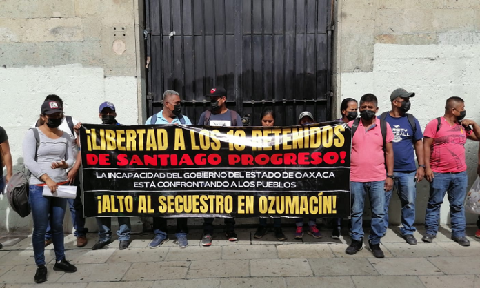 Los inconformes exigieron al Gobierno de Murat Hinojosa intervenga en la liberación de 10 comuneros que llevan más de 11 días retenidos por autoridades del comisariado de bienes comunales y agente municipal de San Pedro Uzumacin, Ayonzintepec.