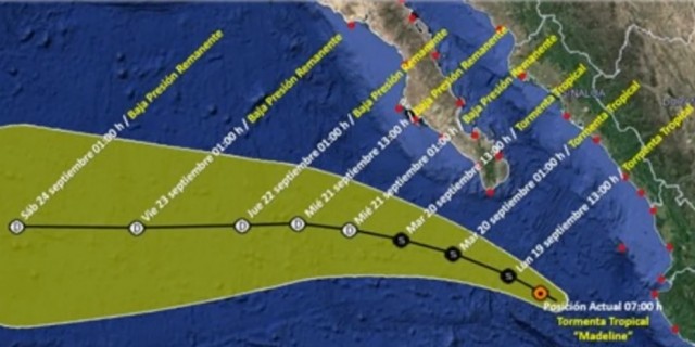 Este lunes, el centro de la Tormenta Tropical Madeline, en interacción con un Canal de Baja Presión sobre la Sierra Madre Occidental, ocasionará lluvias intensas en Jalisco, Nayarit y Sinaloa.