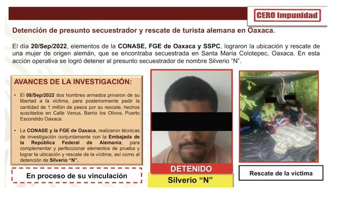 Ricardo Mejía señaló que gracias al actuar de la Unidad antisecuestros y de la Fiscalía de Oaxaca se logró ubicar el paradero de la víctima y se pudo restablecer con la embajada de Alemania y familiares de la Víctima.