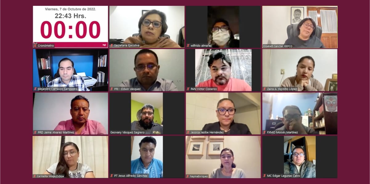 La sesión extraordinaria urgente en su modalidad virtual estuvo encabezada por la consejera presidenta, Elizabeth Sánchez González; las consejeras electorales Carmelita Sibaja Ochoa, Jessica Jazibe Hernández García, Nayma Enríquez Estrada y Zaira Alhelí Hipólito López; los consejeros electorales Alejandro Carrasco Sampedro y Wilfrido Lulio Almaraz Santibáñez; además de las representaciones de los partidos políticos.