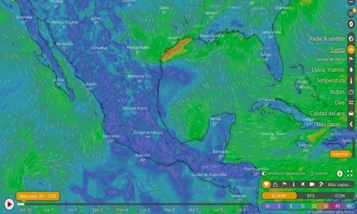 Durante este día, un frente frío se desplazará rápidamente sobre el noreste del país e interaccionará con un canal de baja presión en el oriente de la República Mexicana, produciendo lluvias intensas en Veracruz y San Luis Potosí, así como muy fuertes (50 a 75 mm) en Tamaulipas, Puebla, Hidalgo y Oaxaca, las cuales estarán acompañadas de descargas eléctricas y podrían incrementar los niveles de ríos y arroyos, deslaves e inundaciones en zonas bajas de dichas entidades. Asimismo, la masa de aire frío que impulsa al frente, en interacción con la corriente en chorro subtropical, originarán vientos con rachas de hasta 60 km/h en Chihuahua, Coahuila, Durango, Nuevo León, Aguascalientes y Tamaulipas; con rachas de hasta 90 km/h en el Istmo y Golfo de Tehuantepec. Por otra parte, el ingreso de humedad proveniente del Océano Pacífico, Golfo de México y Mar Caribe, propiciarán lluvias y chubascos en el occidente, centro, sur y sureste del país, además de la Península de Yucatán, con lluvias puntuales fuertes en Querétaro, Guerrero, Chiapas y Tabasco.