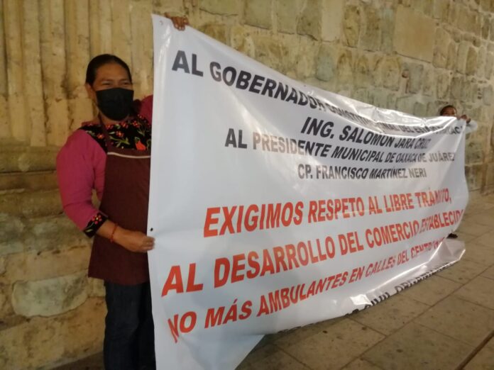 Comerciantes establecidos del centro histórico de la ciudad de Oaxaca se manifestaron en la calle de Valdivieso en el centro de la ciudad.