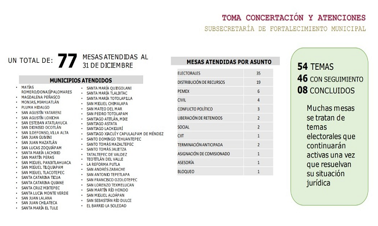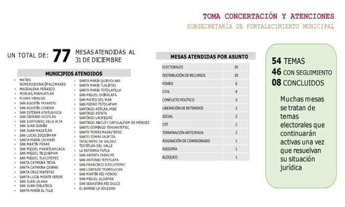 De frente al proceso de renovación de autoridades en 417 municipios regidos bajo los Sistemas Normativos Indígenas, el Gobierno del Estado de Oaxaca atendió 77 mesas de trabajo hasta el 31 de diciembre del 2022.