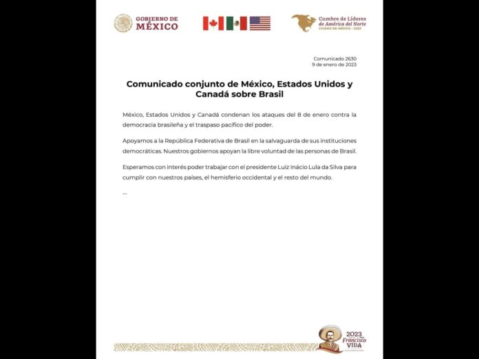 México, Estados Unidos y Canadá expresaron su condena a los ataques del 8 de enero contra la democracia brasileña y el traspaso pacífico del poder.