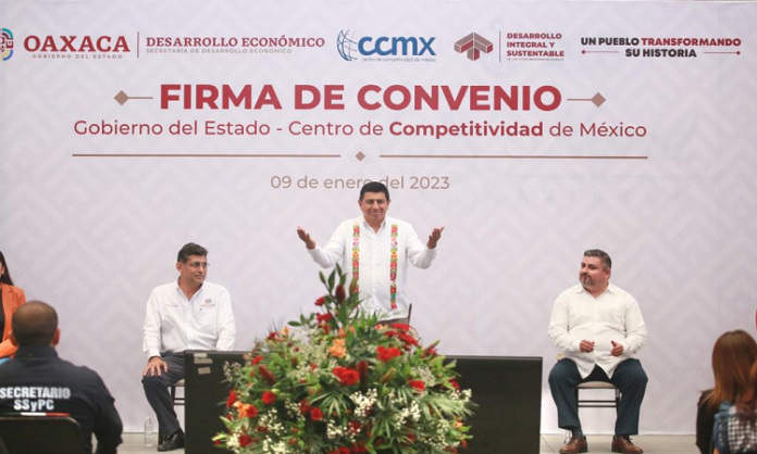 El Gobernador del Estado, Salomón Jara Cruz, atestiguó la firma del convenio de colaboración entre la Secretaría de Desarrollo Económico y el Centro de Competitividad de México (CCMX), el cual tiene como objetivo impulsar la profesionalización, el desarrollo y el crecimiento de las MiPymes y las y los emprendedores oaxaqueños.