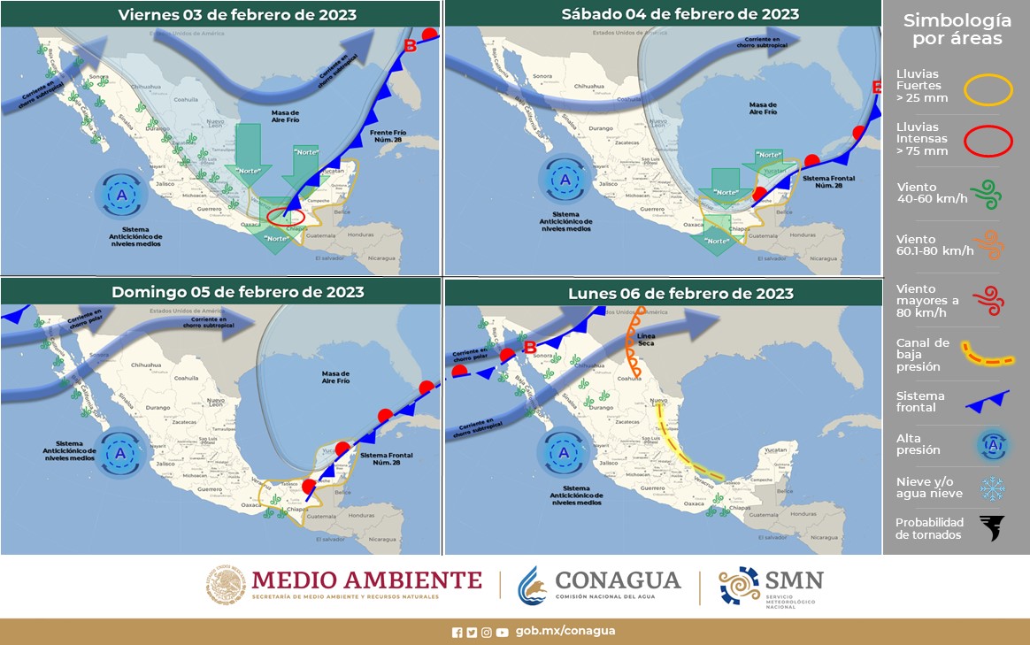 Para hoy, el frente frío Núm. 28 continuará desplazándose sobre el sureste del país y gradualmente la Península de Yucatán, generará lluvias puntuales torrenciales en Tabasco, Oaxaca y Chiapas, lluvias intensas en Veracruz y Campeche, lluvias muy fuertes en Yucatán y Quintana Roo. Dichas lluvias podrían originar el incremento en los niveles de ríos y arroyos, deslaves e inundaciones en los estados mencionados. La masa de aire frío que impulsa al sistema frontal, cubrirá gran parte de la República Mexicana, por lo que se prevé evento de “Norte” de muy fuerte a intenso con rachas de hasta 120 km/h con oleaje de 3 a 5 metros de altura en el Istmo y Golfo de Tehuantepec; rachas de hasta 100 km/h con oleaje de 2 a 4 metros de altura en costas de Tamaulipas, Veracruz y Tabasco; y de hasta 70 km/h con oleaje de 1 a 3 metros de altura en Campeche y Yucatán. Así como densos bancos de niebla en los estados del centro, Sierra Madre Oriental y sureste mexicano; ambiente matutino frío a muy frío con heladas sobre entidades del noroeste, norte, noreste, oriente y centro del país, además de ambiente gélido en las sierras de Sonora, Chihuahua, Durango y Zacatecas. Por otro lado, una circulación anticiclónica en niveles medios de la atmósfera originará baja probabilidad de lluvia sobre el occidente y sur de la República Mexicana.