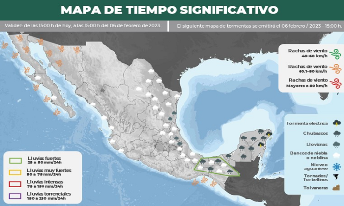 Durante este día, el frente Núm. 28 continuará como estacionario sobre la Península de Yucatán e interaccionará con un canal de baja presión en el sureste de México, ocasionando lluvias e intervalos de chubascos acompañados de descargas eléctricas en dichas regiones, además de viento de componente norte con rachas de hasta 70 km/h en el Istmo y Golfo de Tehuantepec, con oleaje de 1 a 3 metros de altura en dicho golfo. Se prevé que al finalizar el día se desplace sobre el occidente del Mar Caribe, dejando de afectar al territorio mexicano. Por otra parte, el frente frío Núm. 30 se desplazará sobre el noroeste del país y gradualmente sobre el norte de la República Mexicana, continuará interaccionando con una vaguada polar y con la corriente en chorro polar, así como con una línea seca sobre Coahuila, produciendo rachas fuertes de viento de hasta 80 km/h con tolvaneras en la Península de Baja California, noroeste de México y entidades de la Mesa del norte. A su vez, se prevé viento de componente sur con rachas de hasta 70 km/h en el noreste del territorio nacional y viento de componente norte con rachas de hasta 80 km/h y oleaje de 2 a 4 metros de altura en la costa oeste de la Península de Baja California. Finalmente, una circulación anticiclónica en niveles medios de la atmósfera mantendrá tiempo estable y baja probabilidad de lluvia sobre el occidente, centro y sur de México.