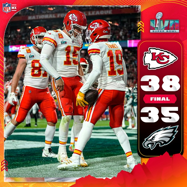 En el último cuarto Kansas City sumó 14 unidades, pero con cinco minutos Filadelfia concretó una anotación y con la conversión igualaron la pizarra a 35 puntos. Gol de campo de Harrison Butker de 27 yardas con ocho segundo el reloj hizo Kansas City vuelva a reinar la NFL y Mahomes vaya alce su segundo Lombardi en su sexto año como profesional.