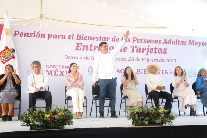 El Gobernador del Estado Salomón Jara Cruz, en compañía de la Presidenta Honoraria del Sistema para el Desarrollo Integral de la Familia (DIF) en Oaxaca, Irma Bolaños Quijano, y de la secretaria de Bienestar del Gobierno de México, Ariadna Montiel realizaron la entrega de tarjetas para las personas de la tercera edad beneficiarias de la Pensión Universal para Personas Adultas Mayores.