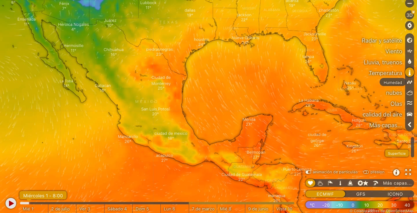 Para el día de hoy, un sistema anticiclónico en niveles medios de la atmósfera mantendrá condiciones estables y temperaturas muy calurosas en gran parte del país, con temperaturas máximas de 40 a 45°C en zonas de Tamaulipas, San Luis Potosí, Veracruz, Hidalgo, Morelos, Guerrero y Oaxaca. De igual manera continuará el viento de componente sur (Surada) con rachas de 50 a 70 km/h en el noreste, oriente y sureste del país, incluida la Península de Yucatán.