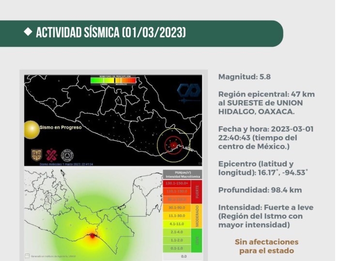 La Coordinación Estatal de Protección Civil y Gestión de Riesgos de Oaxaca informó que tras el monitoreo realizado en las regiones del estado, no se reportaron afectaciones derivadas del sismo percibido a las 22:40 horas, de magnitud 5.8 y que tuvo epicentro en Unión Hidalgo, Oaxaca.