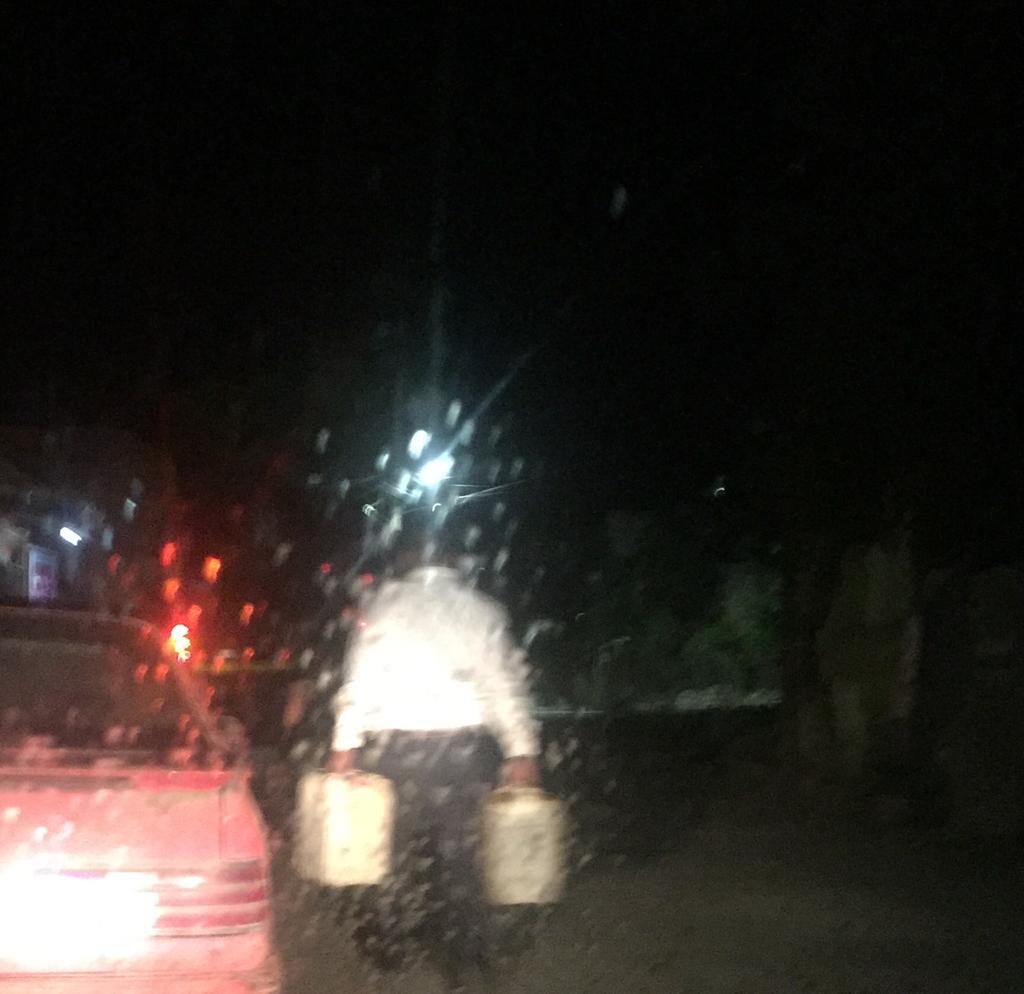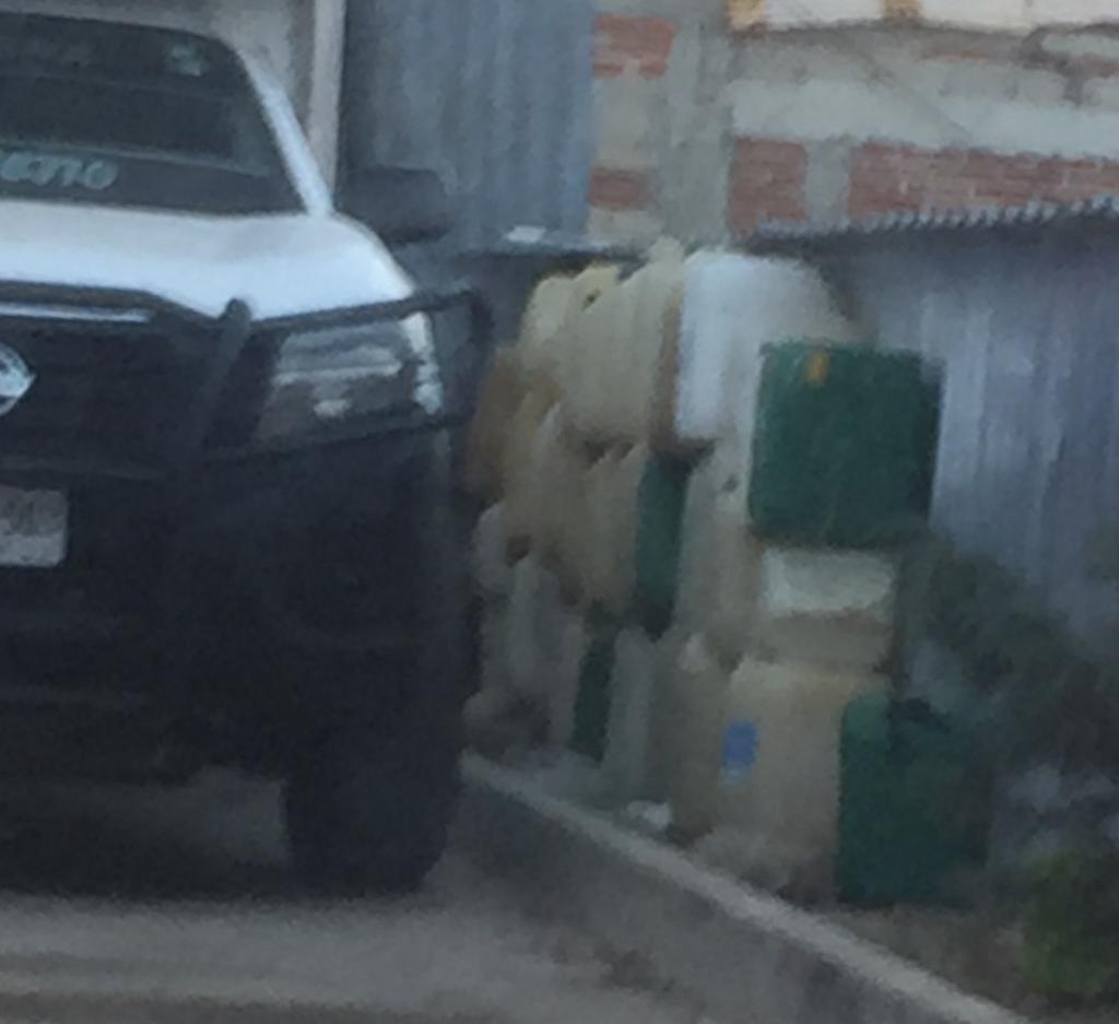 En improvisados galones de 20 litros aproximadamente y una manguera de uso normal, sin ningún tipo de precaución en el manejo de la gasolina, el empleado municipal surte del Diésel a los camioneros que acuden a su casa para llenar sus tanques a cambio de un precio menor, 15 pesos el litro, pues el costo promedio es de 23 pesos con 64 centavos.