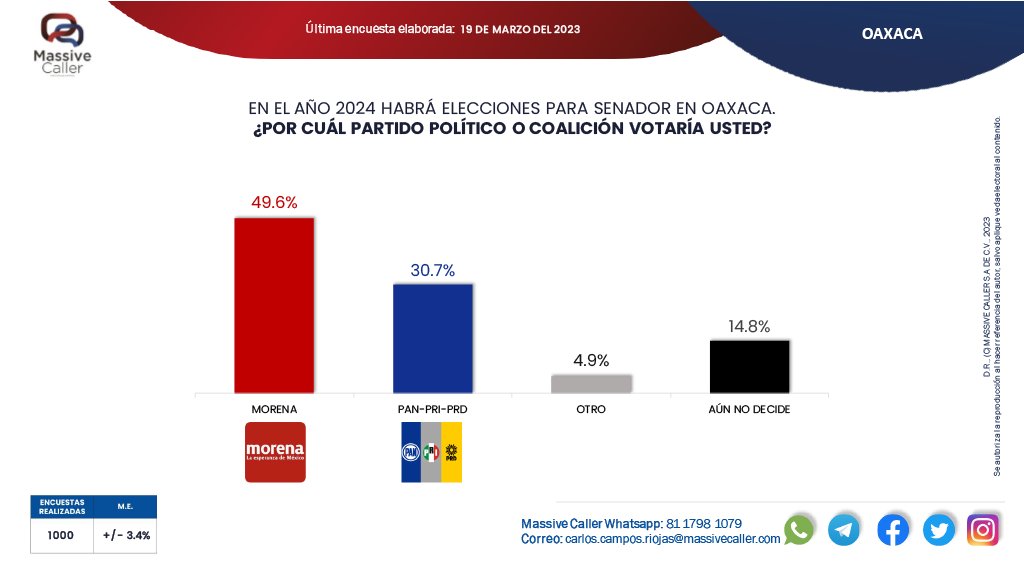 Una ventaja de 19 puntos mantiene Morena en la próxima elección para Senador de Oaxaca sobre la coalición partidista PAN, PRI y PRD, encabezando las preferencias electorales la actual Senadora Susana Harp a Iturribarría, según arroja la más reciente medición de la empresa MassiveCaller, especializada en consultas de opinión a través de encuestas telefónicas.