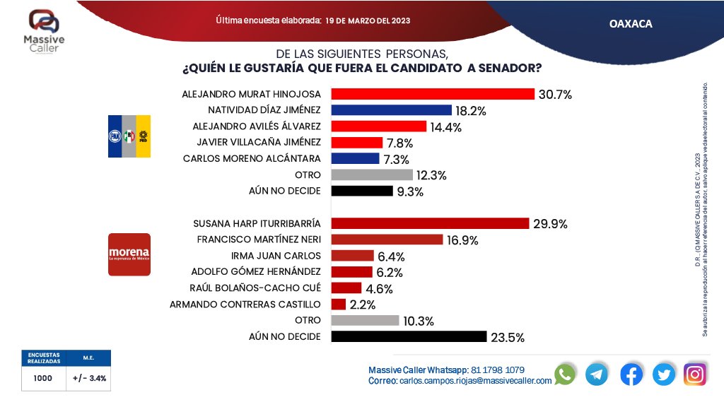 La Senadora morenista Susana Harp y el exgobernador Alejandro Murat Hinojosa, puntean en las preferencias en sus respectivos institutos y coaliciones políticas; el Movimiento de Regeneración Nacional registra un 49.6 por ciento de intención del voto, mientras que la triple alianza partidista ( PAN, PRI y PRD) un 30.7 por ciento.
