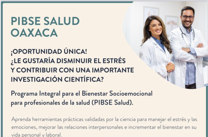 Servicios de Salud de Oaxaca (SSO) invita al personal médico de las áreas de enfermería, psicología, odontología, así como de laboratorio, verificación, promotoría, administrativa, entre otras, que tengan adscripción a la Jurisdicción Sanitaria número Uno Valles Centrales y que se encuentren en contacto con la población, a participar en el Programa Integral para el Bienestar Socioemocional dirigido a profesionales de la salud (PIBSE Salud).