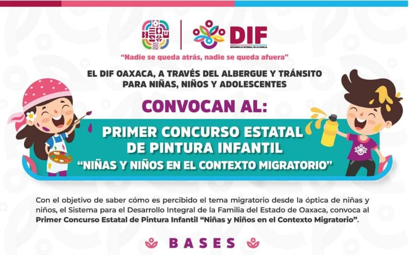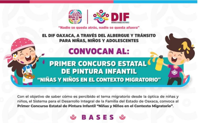El Sistema DIF Oaxaca convoca a participar en el Primer Concurso Estatal de Pintura Infantil “Niñas y Niños en el Contexto Migratorio”, la cual estará vigente hasta las 15 horas del 22 de mayo del presente año y en el que podrán participar infancias de 6 a 11 años, tanto oaxaqueñas como quienes sean migrantes en tránsito por la entidad y cumplan este rango de edad.