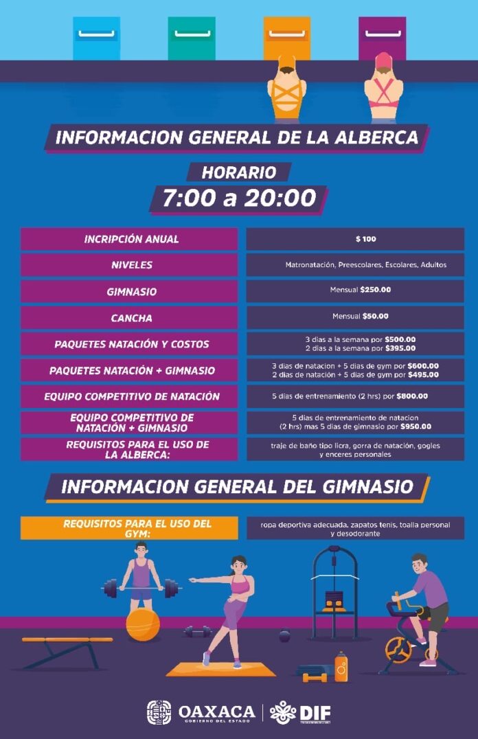 Oaxaca de Juárez, Oax., 7 de mayo de 2023.- Bajo la premisa de promover el deporte entre las y los oaxaqueños, el Sistema para el Desarrollo Integral de la Familia (DIF) Oaxaca a través del Centro de Rendimiento Deportivo Inclusivo (Credi), invita a las personas interesadas a inscribirse en los paquetes para utilizar la cancha, alberca y el gimnasio del organismo, los cuales ofrecen un horario de atención de lunes a viernes de 7:00 a 20:00 horas.