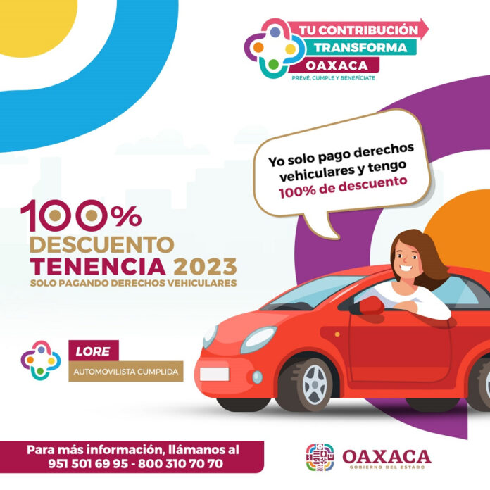 Con la campaña “Tu contribución transforma Oaxaca, prevé, cumple y benefíciate”, el Gobierno del Estado a través de la Secretaría de Finanzas invita a personas propietarias y tenedoras de vehículos aprovechar el estímulo fiscal en el pago del Impuesto sobre Tenencia.