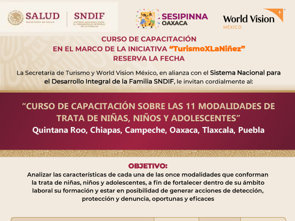 Por ello, invitó a personas servidoras públicas y prestadoras de servicios turísticos, organizaciones de la sociedad civil y público en general a participar en la capacitación “Sensibilización sobre trata y explotación de niñas, niños y adolescentes, un llamado a la acción desde el sector de los viajes y el turismo”, que será impartida en línea los días 12 de mayo de 11:00 a 13:00 y 15 de mayo de 10:00 a 14:00 horas.