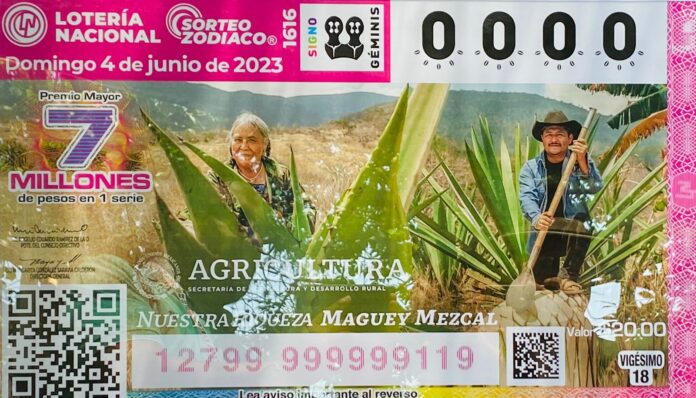 La Lotería Nacional develó el billete “Nuestra riqueza: el Maguey Mezcal” que cuenta con 2.4 millones de billetes impresos en los que destacan la maestra mezcalera Bertha Vásquez, originaria de San Baltazar Chichicápam y el maestro mezcalero Ángel Cruz Robles de Sola de Vega, elegidos por la importancia de Oaxaca, considerada la “Capital Mundial del Mezcal”.