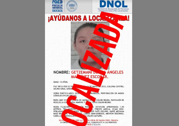 La Fiscalía General del Estado de Oaxaca (FGEO) encontró a una adolescente de 13 años de edad, identificada como G. A. M. E., quien estaba reportada como No Localizada desde el pasado 16 de mayo de 2023.