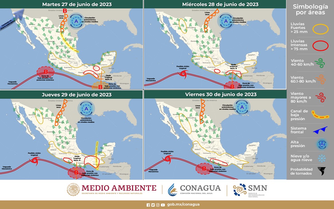 Para hoy, una amplia zona de baja presión con alta probabilidad para desarrollo ciclónico al suroeste de las costas de Colima y Jalisco, generará aporte de humedad hacia el occidente y sur del territorio nacional, originando lluvias puntuales muy fuertes en Nayarit, Jalisco, Colima, Michoacán y Guerrero. Por otra parte, la aproximación de la onda tropical Núm. 8 en interacción con una segunda zona de baja presión con alta probabilidad para desarrollo ciclónico al oriente del Golfo de Tehuantepec, dará lugar a lluvias puntuales intensas en Oaxaca, Chiapas y Tabasco, lluvias puntuales muy fuertes en Campeche y Yucatán, y lluvias fuertes en Quintana Roo y en el sur de Veracruz. Un canal de baja presión desde el noroeste hasta el centro del país, ocasionará chubascos en dichas regiones y lluvias puntuales fuertes en el Estado de México. Una línea seca sobre Coahuila, propiciará fuertes rachas de viento de 60 a 80 km/h y tolvaneras en la Mesa del Norte y el noreste de México. Finalmente, la circulación anticiclónica en niveles medios de la atmósfera, mantendrá el ambiente muy caluroso en Baja California, Sonora, Sinaloa, Chihuahua, Coahuila, Nuevo León y Tamaulipas.