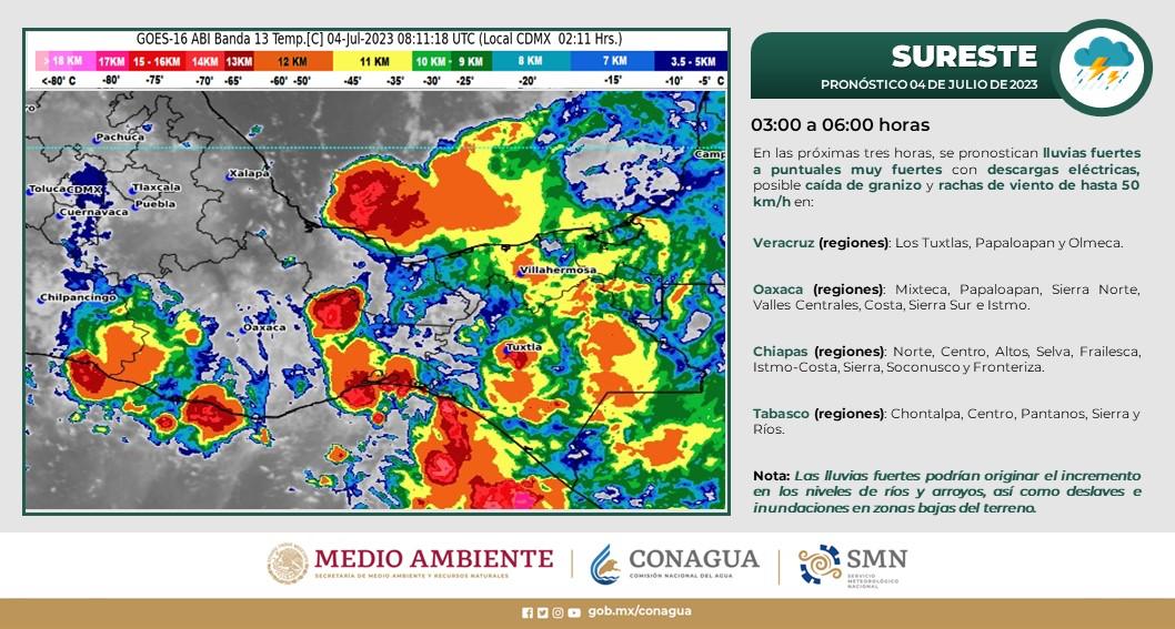 La Coordinación Estatal de Protección Civil y Gestión de Riesgos (CEPCyGR) informa que de acuerdo con la Comisión Nacional del Agua (Conagua) para este martes se prevén lluvias acompañadas de actividad eléctrica, rachas de viento y chubascos fuertes en periodos cortos con posibilidad de la caída de granizo en las regiones de los Valles Centrales, Sierra Sur y Sierra Juárez.