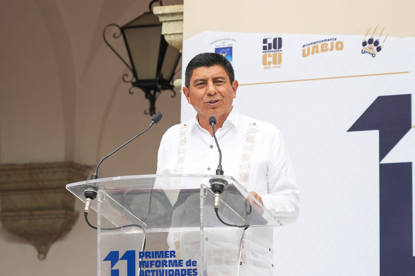 Al acudir a la presentación del Primer Informe de Actividades del rector de la Universidad Autónoma Benito Juárez de Oaxaca (UABJO) Cristian Eder Carreño López, el Gobernador Salomón Jara convocó a la comunidad universitaria a fortalecer la alianza por la educación superior.