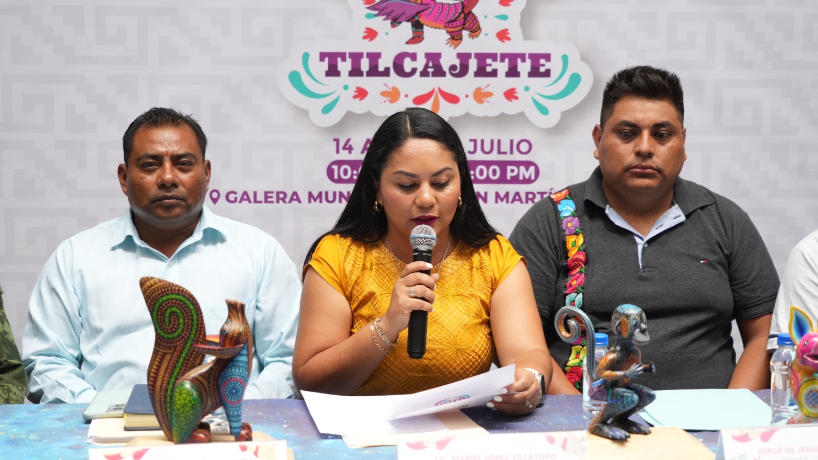 En conferencia de prensa conjunta con el edil de San Martín Tilcajete Aarón Martín Jiménez Ojeda y el presidente del Comité de Artesanos del lugar Jorge de Jesús Ortega Ojeda, la subsecretaria de Desarrollo Turístico de la Sectur Mariel López Villatoro, destacó la importancia de apoyar los esfuerzos de los pueblos de artesanos porque generan mayor afluencia de visitantes y derrama económica a favor de las familias.