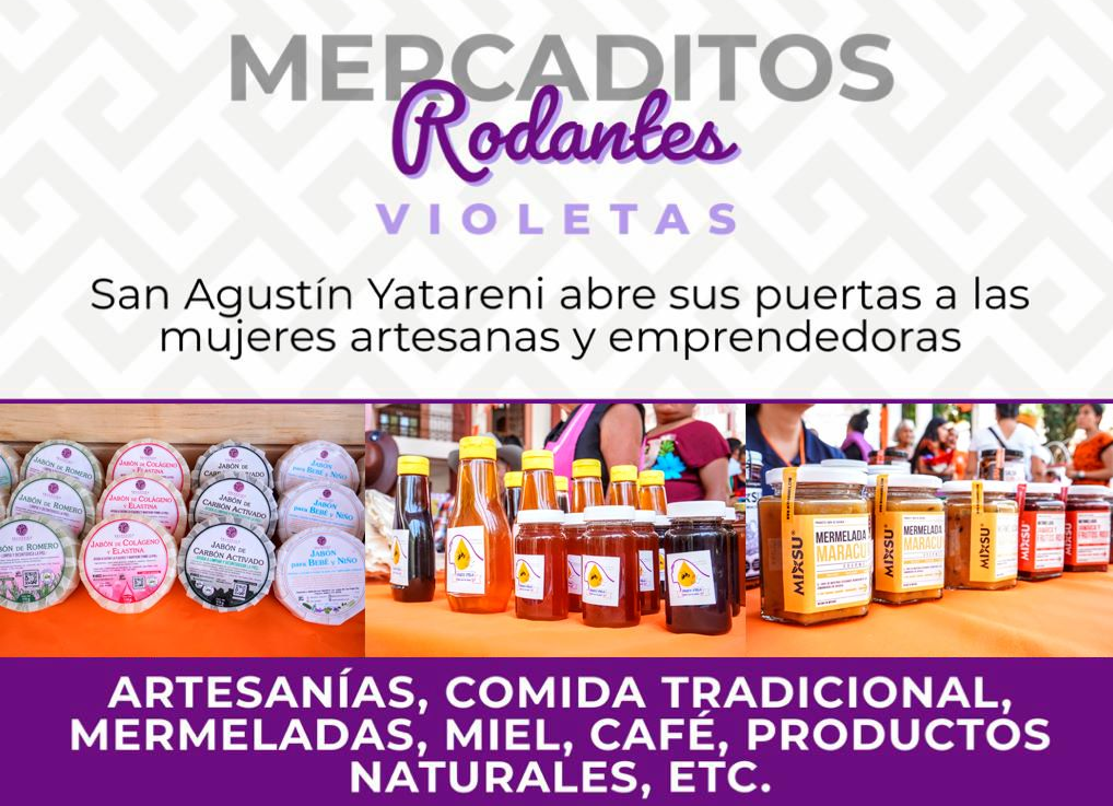 La Secretaría de las Mujeres, en coordinación con la Secretaría de Desarrollo Económico (Sedeco) y el Ayuntamiento de San Agustín Yatareni, invitan a la ciudadanía en general, así como al turismo nacional y extranjero a la primera edición de Mercaditos Rodantes Violetas que se realizará en este municipio.