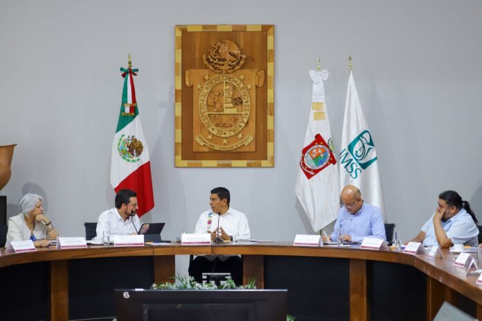El Gobernador Salomón Jara Cruz y el director general del Instituto Mexicano del Seguro Social (IMSS) Zoé Robledo encabezaron una reunión de trabajo en la que participaron autoridades del sector salud federal y estatal para fortalecer los avances en la centralización de los servicios sanitarios en la entidad al Órgano Público Descentralizado (OPD) IMSS-Bienestar.