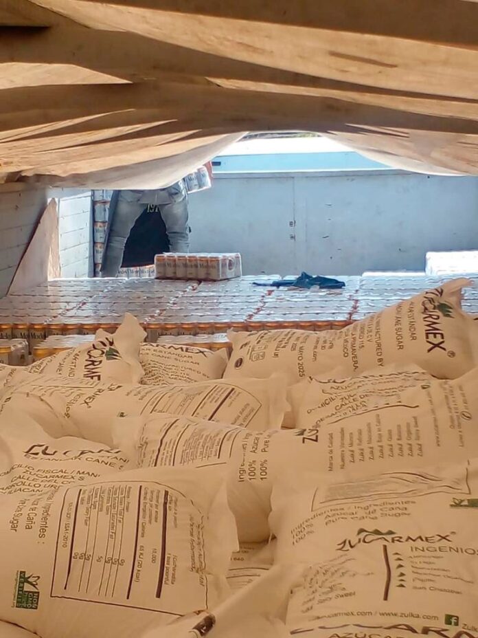 Al efectuar la inspección de la caja del tráiler, los Agentes observaron que, escondido detrás de bultos de azúcar, se encontraba un cargamento de charolas de cerveza, presuntamente clonadas, según las primeras indagatorias realizadas por esta institución.