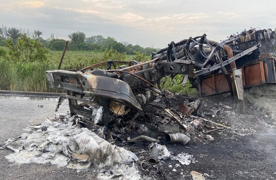 Oaxaca de Juárez. Un tráiler calcinado y a cuatro personas lesionadas fue el saldo de un fuerte accidente vial sobre la carretera transístmica, a la altura de Mogoñé, San Juan Guichicovi.
