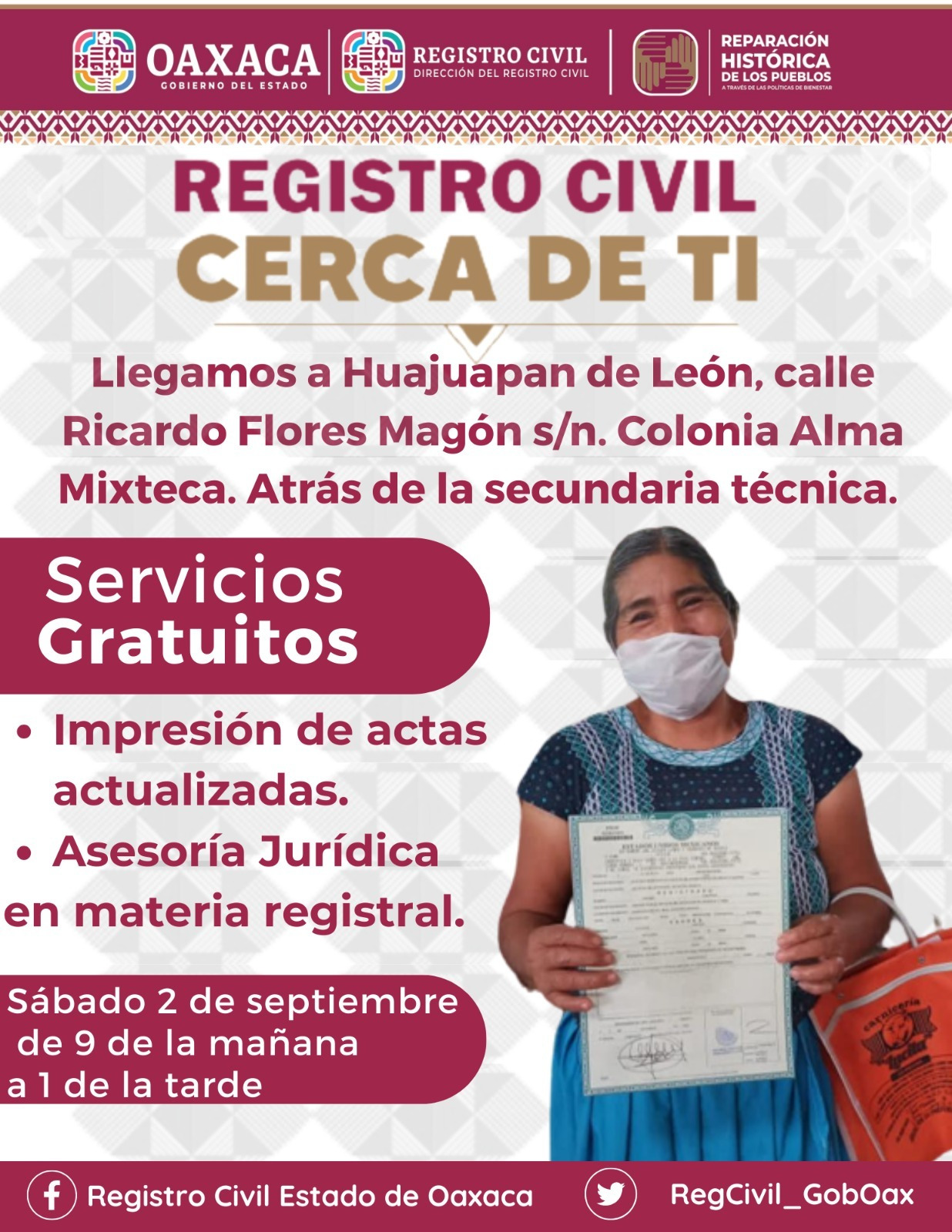 Bajo la premisa de ser un gobierno cercano al pueblo, la Dirección del Registro Civil realizará esta actividad en Huajuapan de León, Salina Cruz, en San Martín Lachilá, Santiago Cacaloxtepec y San Pedro Quiatoni para ofrecer servicios gratuitos en material registral en un día inhábil.