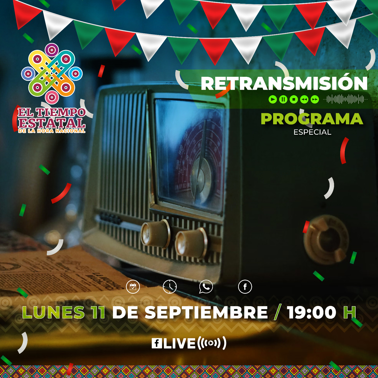 La retransmisión del programa se podrá disfrutar el día lunes 11 de septiembre a partir de las 19:00 horas, en la plataforma de Facebook Live de la página oficial: https://www.facebook.com/eltiempoestataldelahoranacional