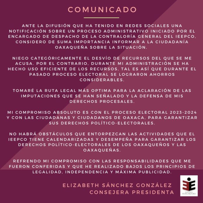 Elizabeth Sánchez González, Consejera Presidenta del Instituto Estatal Electoral y de Participación Ciudadana de Oaxaca (IEEPCO) negó el desvío de recursos por el que fue acusada a través de la Contraloría General del órgano electoral.