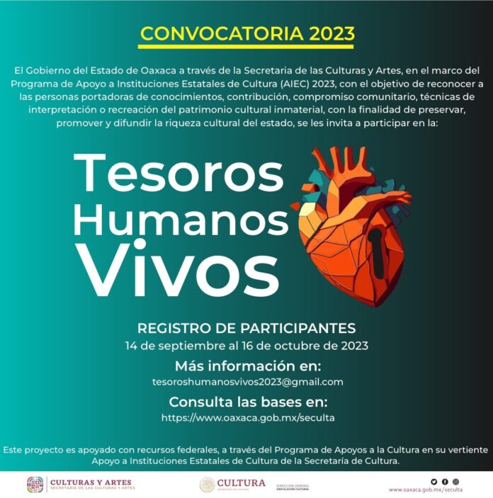 LCon el objetivo de reconocer a las personas portadoras de conocimientos, contribución, compromiso, comunitario, técnicas de interpretación o recreación del patrimonio cultural inmaterial, con la finalidad de preservar, promover y difundir la riqueza cultural del estado, el Gobierno del Estado de Oaxaca a través de la Secretaría de las Culturas y Artes invita a participar en la Convocatoria 2023 Tesoros Humanos Vivos.