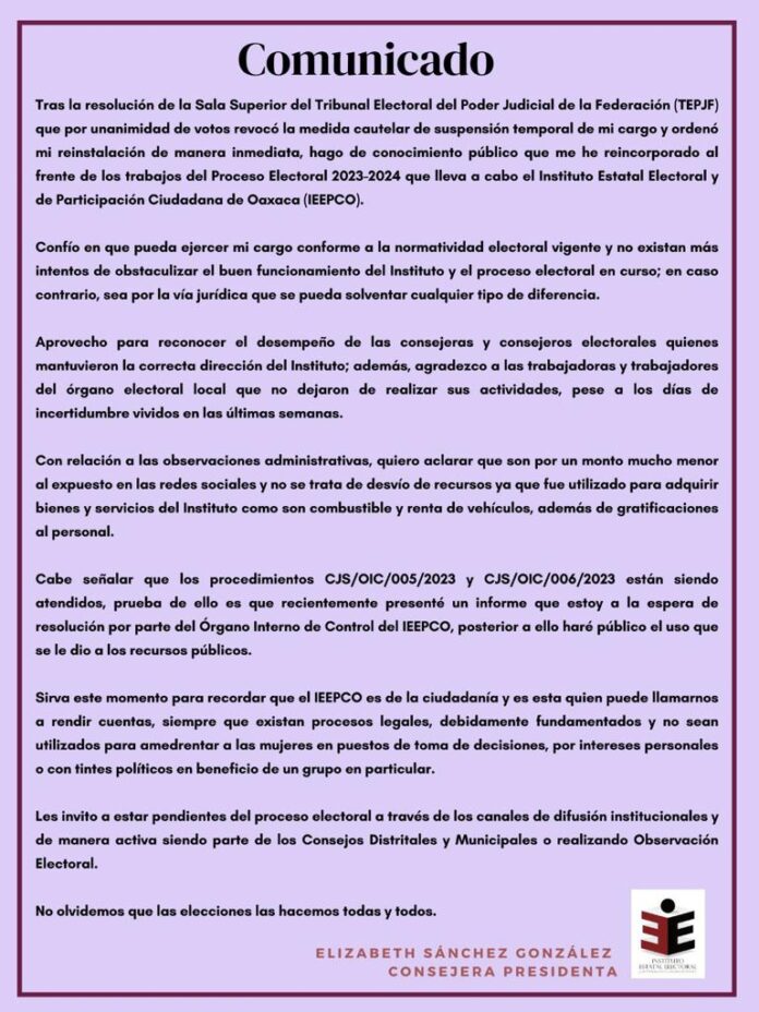 Tras la resolución de la Sala Superior del Tribunal Electoral del Poder Judicial de la Federación (TEPJF) que por unanimidad de votos revocó la medida cautelar de suspensión temporal de mi cargo y ordenó mi reinstalación de manera inmediata, hago de conocimiento público que me he reincorporado al frente de los trabajos del Proceso Electoral 2023-2024 que lleva a cabo el Instituto Estatal Electoral y de Participación Ciudadana de Oaxaca (IEEPCO).