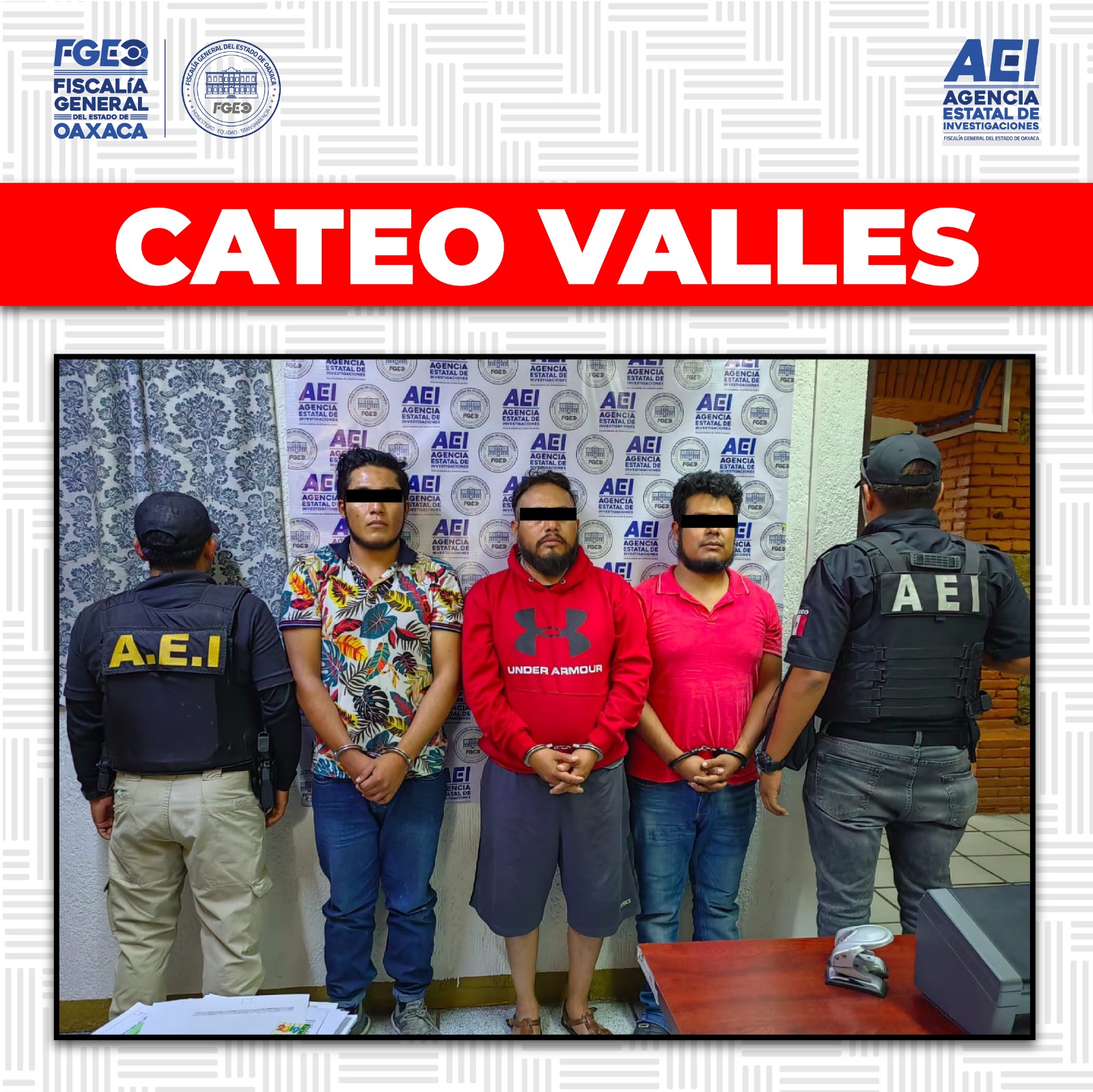 En el lugar, elementos AEI desplegaron un operativo donde dieron cumplimiento al mandato judicial, movilización por la cual lograron la detención de tres personas del sexo masculino identificadas por las iniciales J. C. A. P., R. L. G. y A. S. O. R.