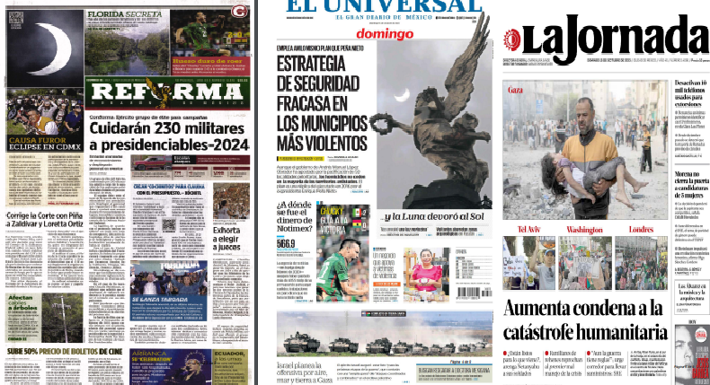 InicioOpinión OpiniónPortada Las de ocho columnas nacionales: Cuidarán 230 militares a presidenciales 2024 Por Maribel Martínez 15 octubre, 2023 09:08 0 630 FacebookXPinterestWhatsApp Estas son las noticias de los principales periódicos nacionales el día de hoy 15 de octubre: Cuota FacebookXPinterestWhatsApp Artículo anteriorEfeméridesRIO: Día Mundial del Lavado de las ManosArtículo siguienteHoy asamblea de pobladores de San Sebastián Tutla para cerrar estación migratoria del gobierno, ante problemas de basuras inseguridad y daños Maribel Martínez Articulos relacionados Locales Amplía Gobierno del Estado “App Oaxaca”, para otorgar servicios a la ciudadanía con solo un click Locales Refuerza SSPC acciones de inspección al transporte público como parte de Oaxaca Segura Sin categoría Capturan cocodrilo de casi tres metros en playa de Oaxaca; lo reubican en su hábitat natural DEJA UNA RESPUESTA Cancelar respuesta Comentario: Por favor ingrese su comentario! Nombre:* Por favor ingrese su nombre aquí Correo electrónico:* ¡Has introducido una dirección de correo electrónico incorrecta! Por favor ingrese su dirección de correo electrónico aquí Sitio web: Guardar mi nombre, correo electrónico y sitio web en este navegador la próxima vez que comente. Siguenos...46,000FansMe gusta8,888SeguidoresSeguir56,777SuscriptoresSuscribirte _ Anuncio _ Ultimos articulos Locales Amplía Gobierno del Estado “App Oaxaca”, para otorgar servicios a la ciudadanía con solo un click Locales Refuerza SSPC acciones de inspección al transporte público como parte de Oaxaca Segura Sin categoría Capturan cocodrilo de casi tres metros en playa de Oaxaca; lo reubican en su hábitat natural Estado Integrantes de la UBISORT toman caseta de Huitzo y cobran su propia cuota Estado Reinstalan bloqueo en la carretera 190; pobladores exigen entrega directa de recursos Cargar más