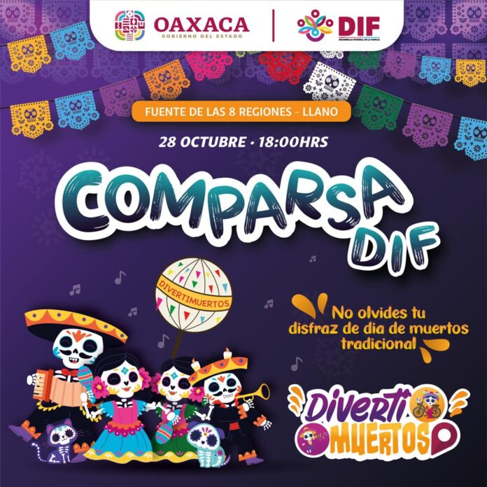 Con la finalidad de continuar con la preservación de las tradiciones ancestrales como lo representa el Día de Muertos para las y los oaxaqueños, el Sistema para el Desarrollo Integral de la Familia (DIF) Oaxaca extiende una invitación al público en general para ser parte de la comparsa denominada ‘Diverti Muertos, llenos de vida’, la cual se llevará a cabo este sábado 28 de octubre, en punto de las 18:00 horas de la Fuente de las Ocho Regiones hacia el Paseo Juárez, el Llano.